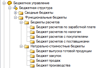 Структура функциональных бюджетов создается в справочнике "Бюджетная структура" (группа справочников "Методы управления" −> группа справочников "Бюджетное управление"). Для этого в указанном справочнике создается папка "Функциональные бюджеты" (Рис.3), в которой в виде структуры папок группируются все функциональные бюджеты, аналогично созданию финансовой структуры.