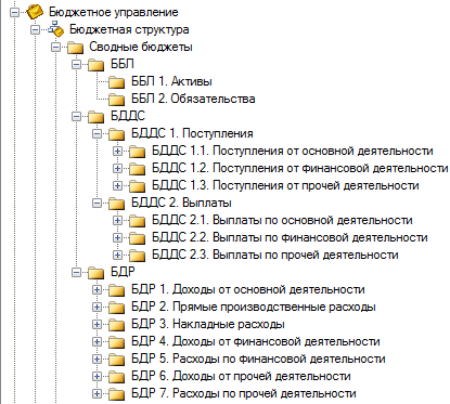 По умолчанию в справочнике "Бюджетная структура" (группа справочников "Методы управления" −> группа справочников "Бюджетное управление") созданы 3 папки сводных бюджетов: бюджет доходов и расходов (БДР), бюджет движения денежных средств (БДДС), бюджет по балансовому листу (ББЛ). Эти 3 бюджета можно объединить в одну папку "Сводные бюджеты" и для каждого из указанных сводных бюджетов создать иерархию статей аналогично созданию иерархии центров финансовой ответственности и функциональных бюджетов (Рис.5).