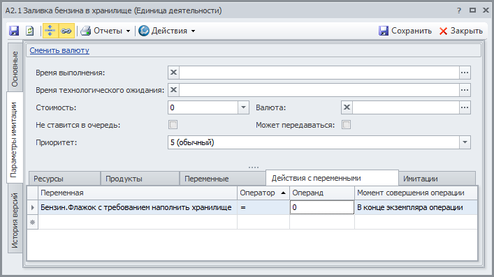 В Окне свойств объекта "Заливка бензина в хранилище" справочника "Деятельность" на вкладке Действия с переменными также зададим действие, которое во время имитации необходимо совершить с экземпляром переменной «Флажок с требованием наполнить хранилище» (Рис.21):