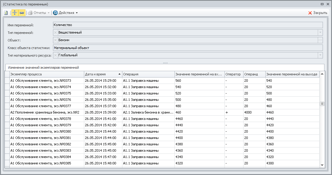 Таким образом, мы модифицировали модель. Теперь как только значение экземпляра переменной "Количество" имитирующего материального ресурса "Бензин" становится меньше 1000 литров, запускается на выполнение экземпляр имитирующего процесса "Пополнение хранилища бензина" и меняется значение экземпляра переменной "Флажок с требованием наполнить хранилище". Новые экземпляры имитирующего процесса "Пополнение хранилища бензина" не будут запускаться до тех пор, пока значение экземпляра переменной "Флажок с требованием наполнить хранилище" не вернется в начальное состояние и не станет равным 0.