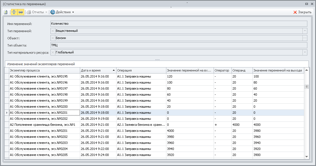 Проанализируем хронологию выполнения одного из таких экземпляров имитирующей операции, например, экземпляра под номером 201 (Рис.28). Количество экземпляров имитирующего процесса "Обслуживание клиента" и экземпляров имитирующей операции "Заправка машины" совпадает, поэтому рассматриваемый нами экземпляр имитирующей операции имеет такой же номер, как и экземпляр имитирующего процесса, номер которого мы видим в окне "Статистика по переменным" в параметре "Экземпляр процесса" - 201.