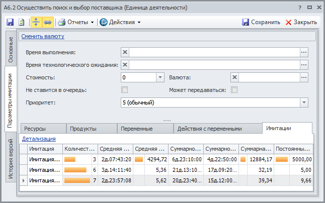 По гиперссылке Детализация открывается Окно свойств выбранной имитации (см. Рис.1 в главе Задание параметров имитации и запуск имитации).