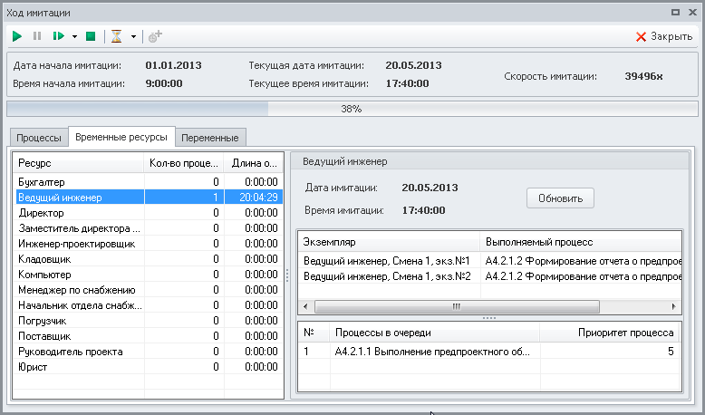 | Кол-во экз. операций в очереди | Отображает количество экземпляров имитирующих операций в очереди к имитирующему временному ресурсу на текущие дату и время имитации. |