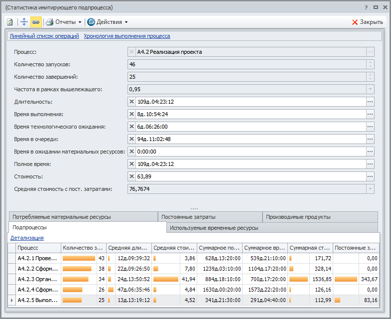 Таким образом, используя вкладку Подпроцессы и гиперссылку Детализация, можно осуществить пошаговый анализ неудовлетворительных значений параметров имитирующего процесса, выделяя на каждом уровне имитирующие подпроцессы с неудовлетворительными характеристиками.