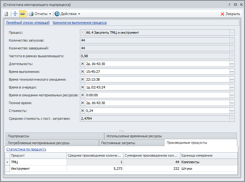 Выделив в этом окне интересующую имитирующую операцию и нажав гиперссылку Детализация, можно открыть окно Статистика имитирующего процесса или Статистика имитирующего подпроцесса, в котором будут представлены данные статистики по выделенной имитирующей операции.