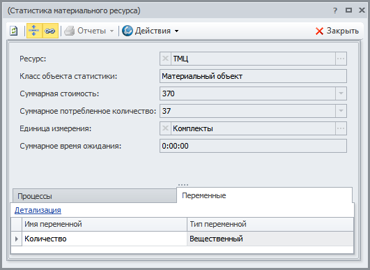 | Процесс | Наименование имитирующего процесса, при выполнении экземпляров имитирующих операций которого потреблялся имитирующий материальный ресурс. |