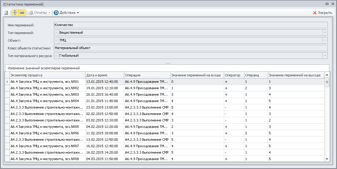 Для анализа изменения значений экземпляра (экземпляров) переменной необходимо выделить строку с наименованием исследуемой переменной и нажать гиперссылку Детализация. Откроется окно Статистика переменной (Рис.3), в котором представлена последовательность действий, совершенных с экземпляром (экземплярами) этой переменной за время имитации. На Рис.3 приведен список действий по изменению значений экземпляра глобальной системной переменной "Количество". Эти действия совершались с экземпляром переменной при выполнении экземпляров имитирующих операций, по результатам которых производился имитирующий продукт или потреблялся имитирующий ресурс "ТМЦ".
