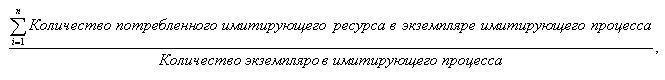 | Средняя стоимость использования | Средняя стоимость потребления имитирующего материального ресурса при выполнении экземпляра имитирующего процесса. Рассчитывается в валюте имитации. Параметр рассчитывается по формуле: |