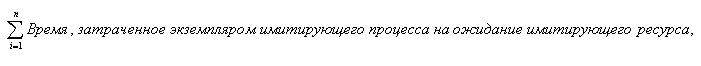 | Суммарное время ожидания | Суммарное время, затраченное экземплярами имитирующего процесса на ожидание имитирующего материального ресурса за время имитации. Параметр рассчитывается по формуле: где n - количество экземпляров имитирующего процесса. В значении параметра учитываются завершенные экземпляры имитирующего процесса и те, которые на момент окончания имитации находились на стадии выполнения. |