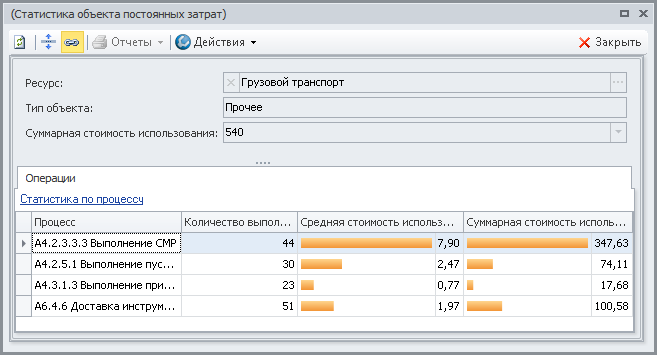 Статистические данные по использованию имитирующих ресурсов типа "Постоянные затраты" при выполнении экземпляров имитирующих процессов представлены в окне Статистика объекта постоянных затрат (Рис.1). Вызов этого окна возможен двумя способами: