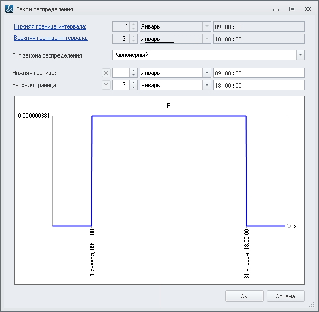 Внимание! Если область значений распределения выйдет за пределы интервала возникновения экземпляров события: [Нижняя граница интервала; Верхняя граница интервала], то экземпляры имитирующего события, возникшие вне границ интервала, при имитации учтены не будут.