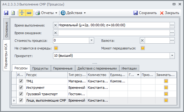Для моделирования использования / потребления ресурса при выполнении экземпляра операции, необходимо на вкладку Ресурсы (Окно свойств объекта справочника Деятельность → вкладка Параметры имитации) (Рис.1) добавить объект справочника "Оргединицы" или "Объекты деятельности".