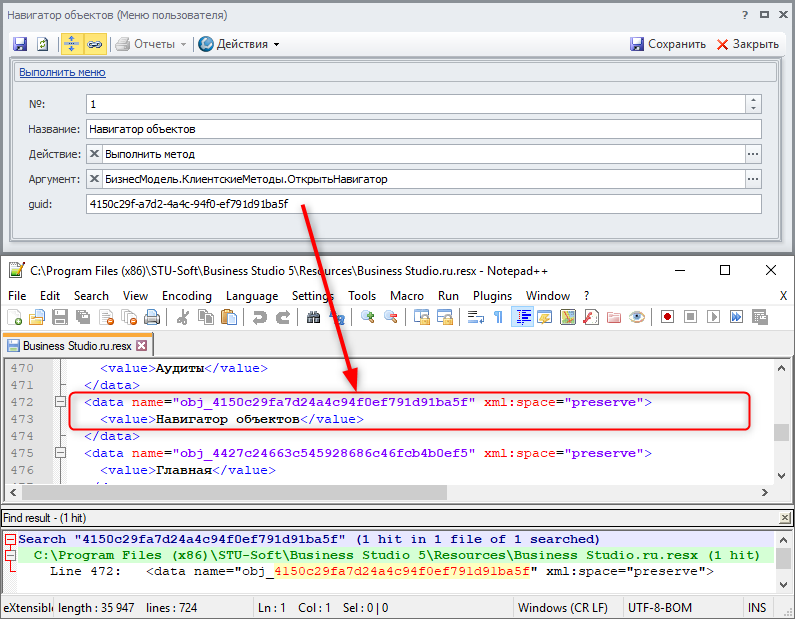 1. Открыть файл ресурса, находящийся по следующему пути: "<Каталог установки Business Studio>\Resources\Business Studio.ru.resx" (все ресурсы пунктов меню хранятся в этой группе .resx файлов).