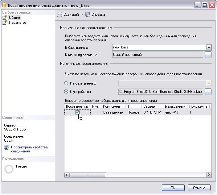 В открывшемся окне "Восстановление базы данных" на странице Общие (Рис. 1) необходимо произвести следующие действия: