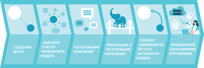 С помощью механизма веток (branches) система берет на себя отслеживание изменений модели в каждом проекте, подготовку вариантов изменений и согласование их в проектной рабочей группе с помощью Business Studio Portal.