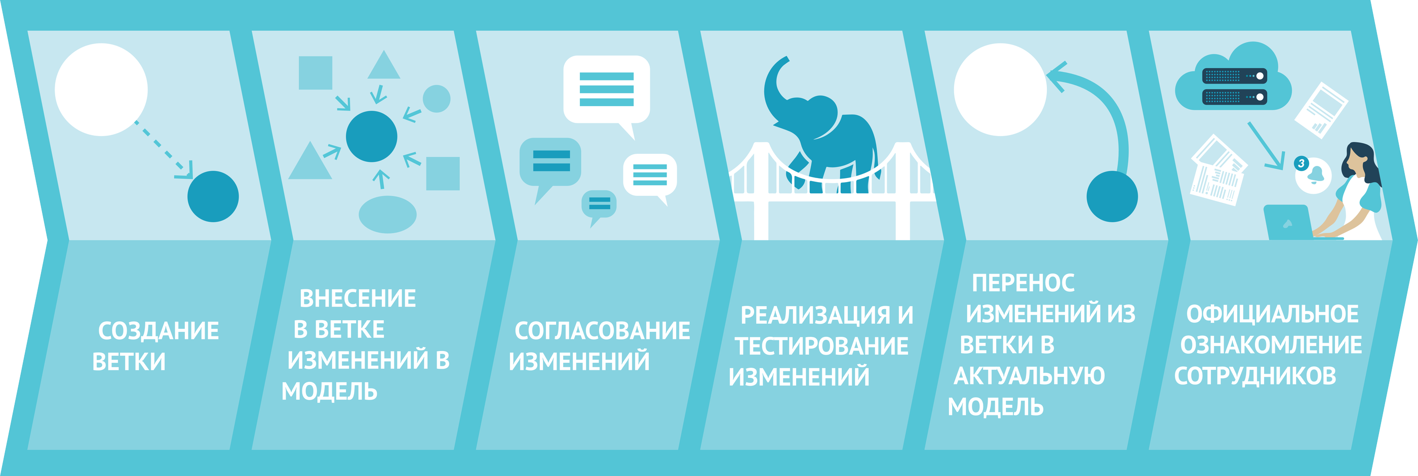 Когда компания прошла этап первоначальной разработки модели своей бизнес-архитектуры и развивается дальше, возникает задача внесения изменений в модель. Часто организационные изменения затрагивают сразу несколько элементов модели: процессы, должности, документы, структуру информационной системы, показатели и т. п. При этом весь блок изменений нужно удерживать как одно целое: согласовывать в рамках рабочей группы, исправлять замечания и переносить в актуальную модель, не забыв ни один элемент.