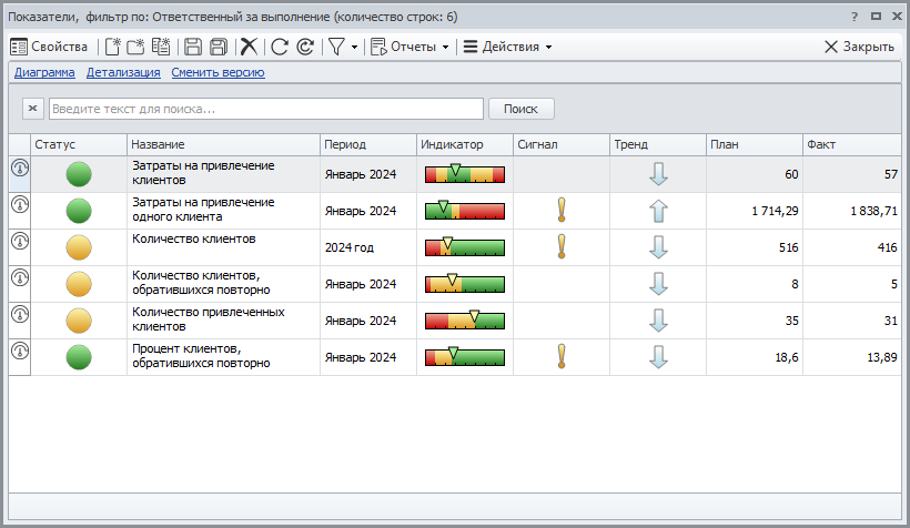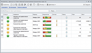 В соответствии с правами, пользователь наглядно видит текущее состояние каждого из показателей, за контроль которых он назначен ответственным, с помощью системы цветовых сигнализаторов;