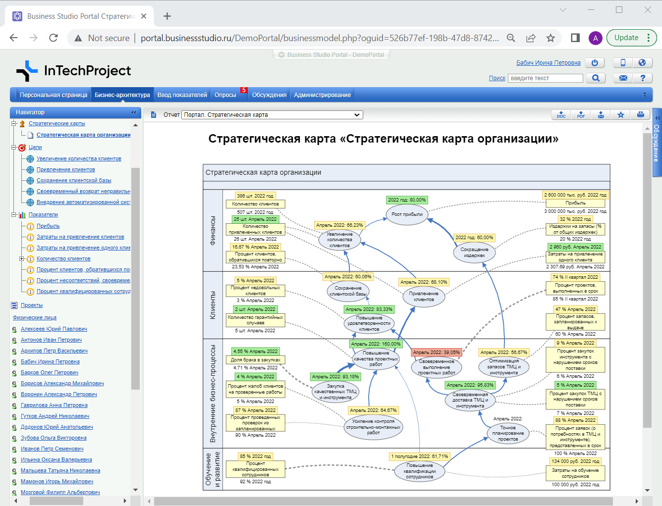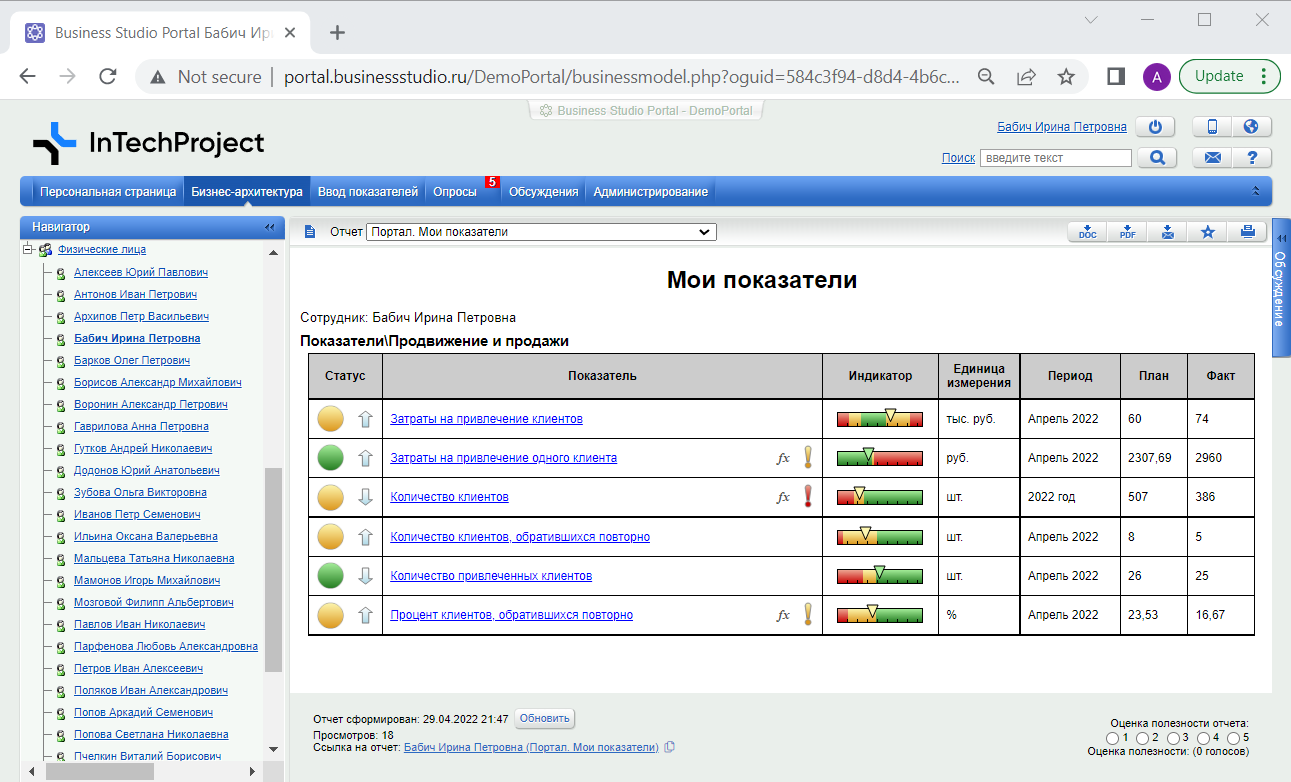 Контроль показателей осуществляется с помощью Business Studio Portal. На портале ответственные лица наглядно видят текущее состояние каждого из ключевых показателей деятельности компании с помощью цветового сигнализатора «Статус».