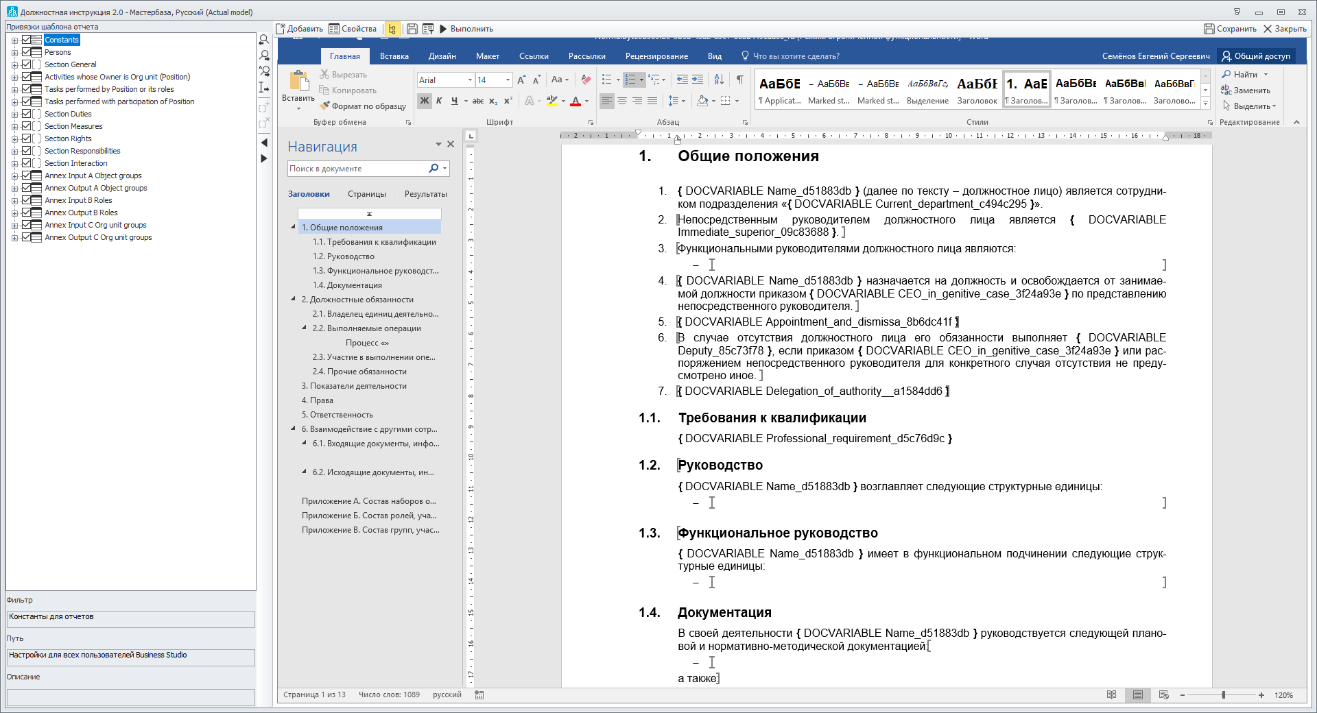Документы формируются на основе спроектированных ранее элементов бизнес-архитектуры: целей, бизнес-процессов, организационной структуры и т. д. Любое изменение в модели бизнес-архитектуры автоматически отражается в регламентирующих документах, поэтому комплект документации всегда поддерживается в актуальном состоянии.