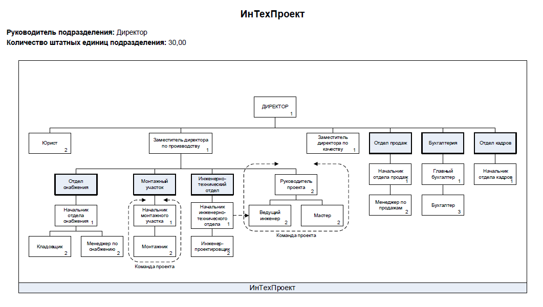 Организационная структура является результатом распределения полномочий и ответственности сотрудников. Система Business Studio позволяет сформировать иерархическую организационную структуру как в справочнике, так и непосредственно на организационной диаграмме, и связать оргединицы с выполняемыми функциями и процессами. Место оргединиц в организационной структуре, их права и обязанности, взаимодействие с другими оргединицами, показатели для оценки эффективности деятельности автоматически фиксируются в документах «Положение о подразделении», «Должностные инструкции» и «Матрица ответственности».