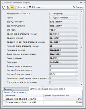 В результате проведения имитационного моделирования и ФСА Business Studio рассчитывает текущую загрузку ресурса, его перегрузку и рекомендуемое количество ресурсов, а также позволяет найти «бутылочные горлышки».