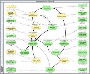 Аналогичным образом осуществляется и контроль достижения стратегических целей. Оценки достижения целей рассчитываются автоматически на основе значений показателей, назначенных им. Общий контроль достижения сразу всех целей можно осуществлять с помощью стратегической карты.