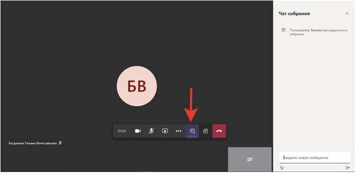 Для отправки текстовых сообщений другим участникам можно воспользоваться «Чатом собрания», кликнув на значок во всплывающем меню.